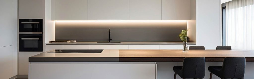 La iluminación juega un papel clave: se emplean tiras LED empotradas, focos direccionables o sistemas lineales que resaltan la geometría del espacio y crean una atmósfera cálida sin saturarla. Además, en proyectos minimalistas se prioriza la eficiencia: el mobiliario ofrece almacenamiento inteligente sin sobrecargar el ambiente, y los electrodomésticos se integran de forma casi invisible para no romper la armonía visual.