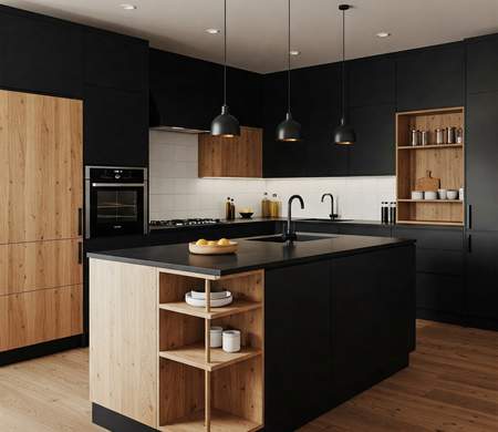 Predominan los tonos oscuros, negro, gris grafito o metálico, equilibrados con texturas cálidas como la madera natural, que aportan contraste y confort. Las tuberías expuestas, los ladrillos vistos y las lámparas colgantes de estilo industrial completan el look con un carácter distintivo. Muebles sencillos, estanterías metálicas y superficies resistentes conforman una cocina robusta, moderna y perfecta para quienes valoran el diseño sin artificios y con una fuerte identidad visual.